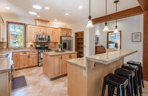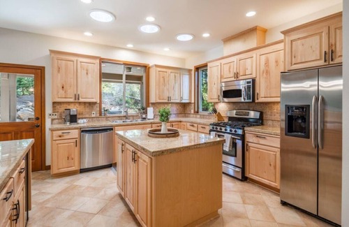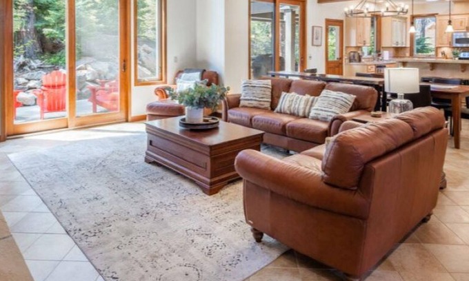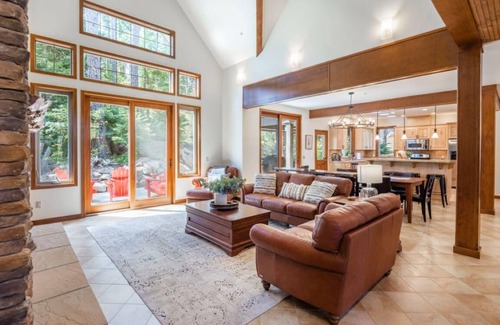 Relax and gather with the modern comforts of this mountain retreat including a spacious covered and heated outdoor dining and BBQ patio, outdoor fire pit, and new private hot tub. Inside, enjoy abundant entertainment options including free high-speed internet, three flat-screen Smart-enabled TVs, and Blu-Ray movie library in addition to Air Conditioning throughout the entire house.