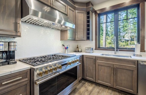 This luxurious mountain home has stunning forest views in the quiet Prospector neighborhood. With outdoor amenities, and plenty of room for families and friends, this vacation rental home has something for everyone.This spacious home offers an open floor plan showcasing all the comforts of home with the perfect atmosphere for socializing. The dining table comfortably seats ten with additional seating for three at the kitchen island. The kitchen features stainless steel appliances including a six-burner range. The spacious great room is perfect for relaxing in front of the floor-to-ceiling stone fireplace.Step outside to the covered patio and entertaining area set up with living room-style seating, six Adirondack chairs, and a dining table that seats four. Additional must-have amenities include a built-in gas BBQ, TV, hot tub, and fire pit: the perfect formula for relaxing and enjoying the outdoors.Sleeps: 14Home features 5 bedrooms and 4.5 bathroomsBedding: 3 kings, 1 queen, 1 twin trundle, 2 bunk beds - full over fullSquare feet: 2,900The main floor master suite has a king size bed and a twin trundle bed. The ensuite bath has dual sinks and a walk-in shower.The 2nd king suite is on the second floor and features a king bed and full ensuite bathroom with a walk-in shower.The 3rd bedroom is on the second floor and features a king bed.The 4th bedroom is also on the second floor and features a queen bed.The 5th bedroom is located on the second floor and features two full over full bunk beds.Two shared full bathrooms are available on the second floor. One has dual sinks and a combination shower tub, and one features a walk-in shower. There is a half bath on the main floor.Additional Amenities:Air conditioningHigh-speed internetLaundry room with full-size washer and dryerPrivate hot tubPrivate firepitNo pets