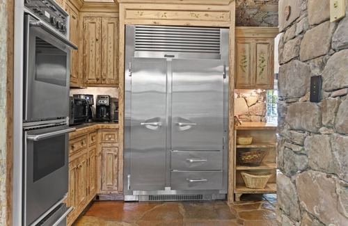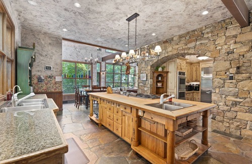 If you’ve finally worn yourself out, it’s time to settle down for the evening. Take your choice from one of the 12 bedrooms set throughout every level of the home. Spend an evening in luxury as you soak in your private tub and warm up by your bedroom’s fireplace, before turning out the lights. After waking to the sound of the nearby stream, you’ll have another day of adventure and leisure ahead. Enjoy breakfast in the sun-soaked kitchen or lounging on the outdoor deck of your choice. The dining and kitchen tables will comfortably sit up to 21. Spend your morning exploring the elaborate train system, which is suspended overhead and travels through the walls of the main floor. Become lost exploring the endless delights of the home, which include a spiral staircase leading to two hidden rooms, a shaded sandbox and outdoor swing for kids, spacious lawns for outdoor dining and meetings, two bunk rooms, bluetooth music, Alexa, 3 flat screen TVs, radiant heat throughout the home, exquisite landscaping, a generator (which will power on automatically in case the home loses power), and endless outdoor adventures. If you’re traveling on business or hosting a company retreat, a mini business center is situated conveniently on the main floor and is equipped with a printer, whiteboard, and a selection of basic office supplies in case of a pinch.