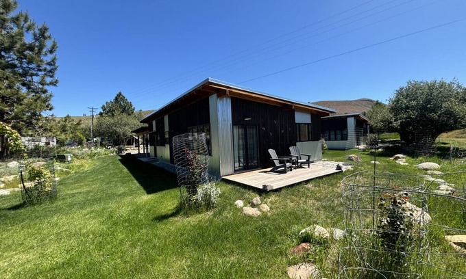 Sunflower Resort Arnica Cabin, newly opened in April of 2024, is a private, modern, pet-and-child-friendly (Pet-Fee Required,) 1000 ft2 cabin with 2 BR(K/Q) and 1 1/2 bathroom, a private carport with EV charging, and just a 10 minute walk from Winthrop’s Western-themed downtown. It is a cabin on its own private cul-de-sac, is very quiet, with no traffic sounds from the public roads nearby, and is surrounded by undeveloped fields.