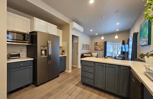 Cabin amenities include a complete kitchen, a 6-ft soaking tub, a private 2-car carport with EV charger, a large sized washer and dryer, a 100% organic queen-sized Avocado latex bed in the master suite, and a second Avocado queen in the second bedroom, air conditioning, central heat, and private back decks with loungers.