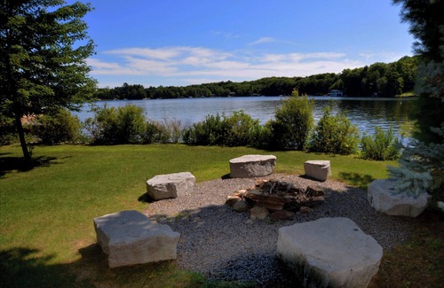 Located just minutes from downtown Port Carling, this gorgeous four bedroom 3 full bath cottage is on a beautifully landscaped lot with trees for privacy and sun all day at the water. A large dock complete with Muskoka chairs and beautiful lake views allows for the ultimate Muskoka experience, especially beautiful in Fall. A gently sloping lot boasts over 200’ of south-facing water frontage with a small sandy beach area, and a convenient fire pit with stone surround. Elegantly decorated with a large well-appointed kitchen, this cottage has 3000 square feet of living area and is perfect for hosting family and friends. The kitchen includes a Nespresso machine, stainless steel appliances, separate wine fridge, dishwasher, microwave and all the necessary small appliances (blender, toaster, kettle, drip coffee maker, waffle maker). Inside the cottage you’ll also find a large farmhouse dining table to seat 8, and a generous family room with multiple seating options. A TV room on the lower level has a family sized sectional and entertainment unit. The two TVs have Apple Boxes with Netflix, Prime and Apple TV.