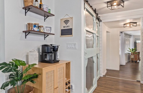 LONG-TERM STAYS ONLY (31+ days). Enjoy a mid-century escape full of modern conveniences in this 3BD, 2BA house featuring a picture-worthy living room, large TVs in every room, remote workspace, coffee nook, and large, shady backyard with patio, fire pit, BBQ. Nestled in a quiet Phoenix neighborhood close to popular restaurants and shopping. Wide driveway offers ample parking. Wake up to your fave brew from our Keurig K-Duo coffee maker or take in the fresh air with a stroll down to Human Bean (5-minute walk). Central air/heating, ceiling fans in every room, and strong WiFi for your remote work needs.