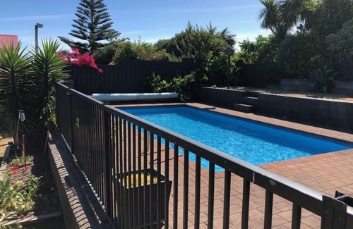 Yes, this Raumati Beach house has a swimming pool. Check the Facility Overview section for details about the pool and other available facilities.