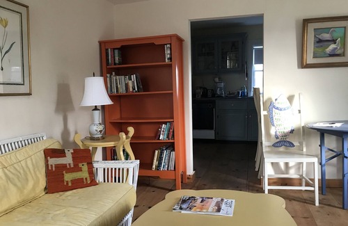 One bedroom upstairs has twin beds, bureau, and chaise longue; the other double bed is at the top of the stairway landing, with a small desk and lots of morning sun. There is a bathroom upstairs as well as downstairs. The downstairs one has a shower stall. Private entry, no interaction with owners needed but we are available to offer local suggestions or for other questions. The owners reside in a separate closed-off space.