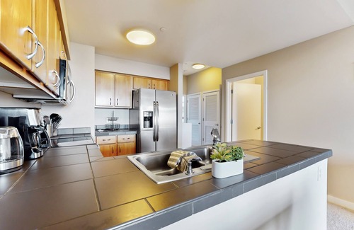 Down the hall, discover comfortable sleeping arrangements, a stackable washer/dryer, sizable bathrooms, and a large walk-in closet. The entire condo is cooled by central air-conditioning, a rarity for PNW rentals.