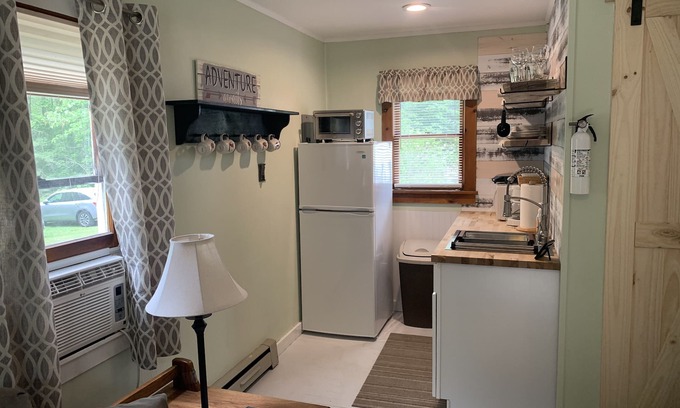 Sunny Cottage, one of the 5 cottages at Cozy Nook was named after a beautiful island near Turtle Bay, in the Northern part of Lake George. Sunny has one bedroom that can sleep two people in it's King-Sized Bed. Additional sleeping for one adult (2 small children) is available on a pull out couch in living room. Linens and towels will NOT be provided. This quaint cottage has a lovely kitchenette, Amish Style high-top table with saddle stools and a mid-sized refrigerator. Available for our guests is an electric burner, microwave, toaster oven, and drip coffee maker.