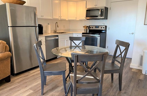The fully equipped kitchen features stainless steel appliances, a Keurig coffee maker, and all your baking essentials. Enjoy breakfast with a view of the ocean from the dining area with seating for 4. The spacious master suite features sneak peeks of the ocean, a king-size bed, and smart Roku TV. The 2nd bedroom features a queen size bed and the full bath is located in the hallway and features a walk-in shower.