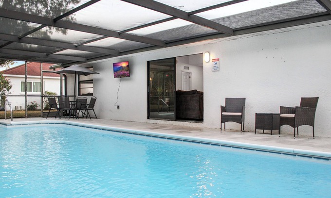 Soak up the Florida sun in the pool or relax in the comfortable loungers. The covered patio features a dining table for four, and smart TV