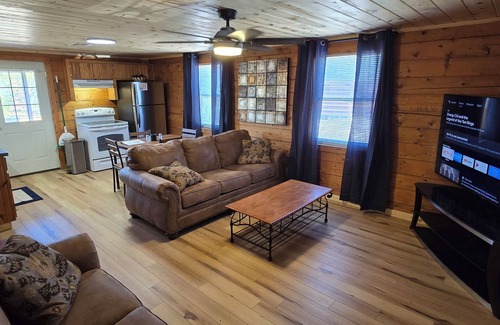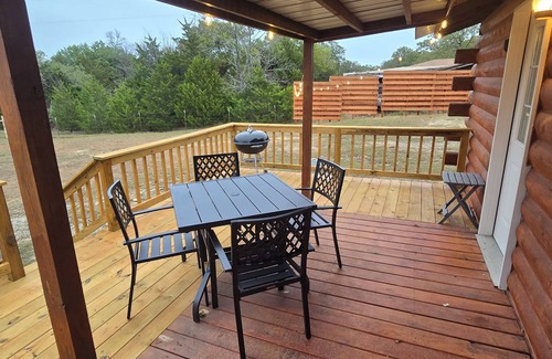 This fully remodeled log cabin is located within minutes of Lake of the Arbuckles in the Arbuckle Mountains. Nestled in a private cove with three other cabins spaced out on a property called Gamble Hollow. It boasts a large shower and bathroom, two queen sized beds, flatscreen with WiFi, a full kitchen with cooking amenities, a fire-pit out back with string lights, outdoor grill and dining area on the deck, and plenty of property to have the privacy to see the stars at night.