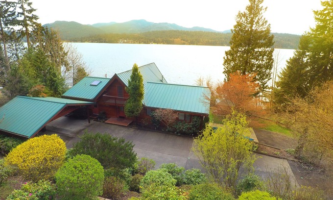 Constructed of cedar logs and situated on 1.1 park-like acres with over 200 feet of no bank private water front, our spacious home feels like a resort lodge. The house includes 4 large bedrooms plus a loft, a bright well-equipped kitchen, a large open living area with floor to ceiling windows, a recreation/home theater room, and a large jacuzzi/soaking tub. We can sleep 10 in real beds (4 queens, 1 double). A large dining table just off the kitchen on the expansive deck provides a great spot for alfresco dining. Our study is equipped with a large built-in desk, high speed internet connection and printer. In addition, we have high speed wireless access throughout the house. With lots of southern exposure the house is bright and sunny year round, offering spectacular views from almost every room.