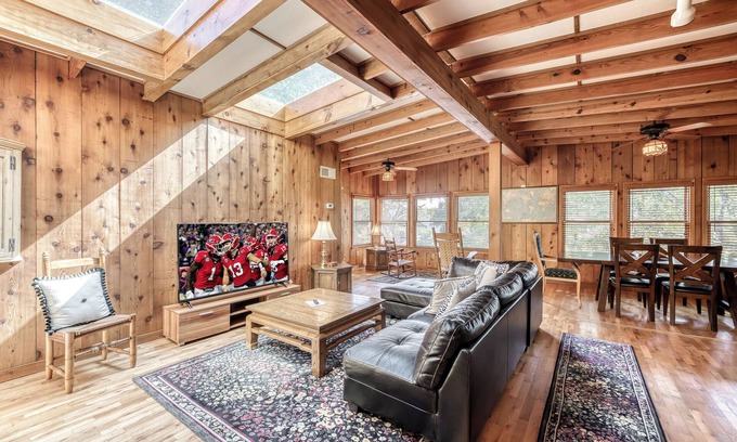 Step into the inviting living room, where stylish decor meets comfortable furnishings. The sofa provides the perfect spot to unwind after a day of Georgia sightseeing. Large picture windows and unique skylights allow natural light to flood the space, creating a warm and welcoming atmosphere.