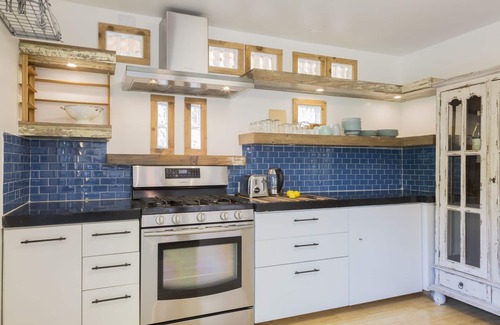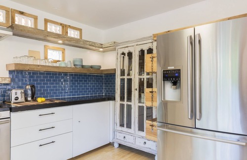 Large kitchen with Bosch dishwasher, stainless refrigerator, gas stove, and Nespresso espresso maker. Kitchen is stocked with espresso pods and a variety of teas. You’ll also find the following: