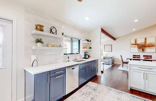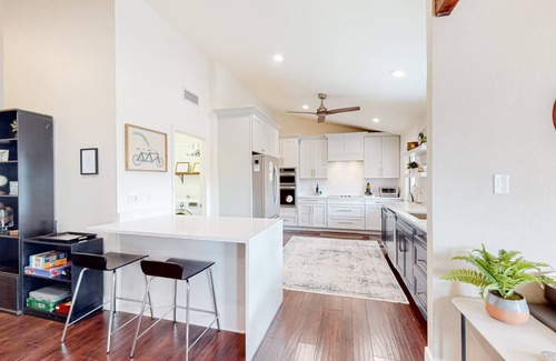 Inside, gather in the main living area while streaming shows and movies on the smart TV, or relax with a good book on one of the twin sofas in the den. The gleaming full kitchen comes well-equipped with a deluxe suite of stainless steel appliances and plenty of counter space for handling easy at-home meal prep. A dishwasher is also included for stress-free cleanup. Everyday home essentials include central air-conditioning, free WiFi, and a private washer/dryer.