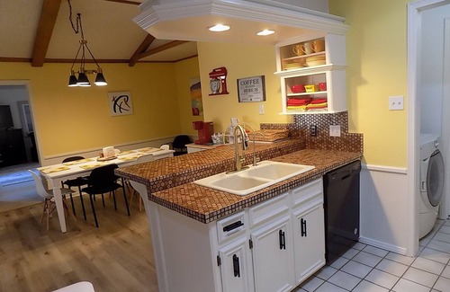 Come stay in this nice neighborhood and enjoy the sunny, private veranda, two big isolated bedrooms with a king bed, a queen bed, two full size beds and two comfy sofas. Three TV's including a 58-inch Samsung, a 55-inch Samsung and a third Roku streaming TV. High speed internet, gas fire logs, new RO water system, two step-in showers and a big garden sunken soaking tub.