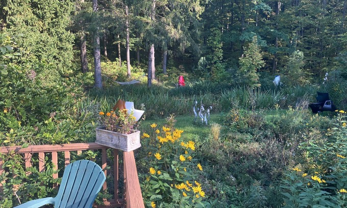 This private, spacious, light filled loft apartment with floor to ceiling windows overlooks private pond, sauna, large garden and woods - the open, uncluttered space and tranquil surroundings are relaxing. Near hiking/biking/running/ski trails, brewery, vineyard, golf course - originally Alice Cook’s house. A queen bed + inflatable bed or rollaway (+1) Safe, quiet, surrounded by nature, wrap-around deck - a peaceful, relaxing, private setting. TV fire stick.