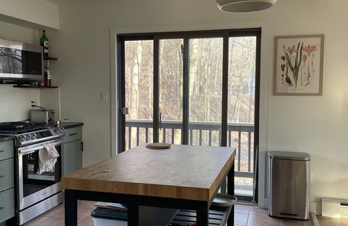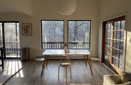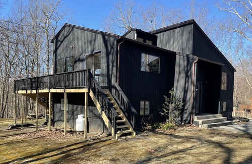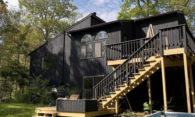 The Cabin at Hopewell is a spacious, serene, and comfort-first home in the Hudson Valley. This 2-acre property features mature oak trees, a creek, a 2-story wrap-around deck, an above-ground pool (May to September!), and all of the amenities you need for a getaway. Newly renovated, the house features natural hardwood floors throughout, extra-large windows to bring the outdoors in, 2 working spaces, and 2 living areas. You'll love this contemporary cabin with old-school character.