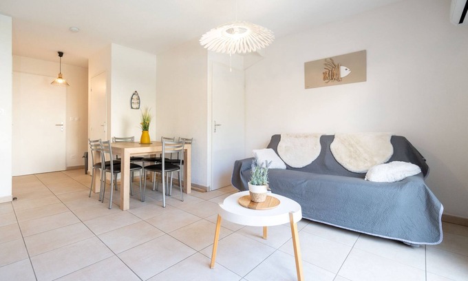 This cozy and light-filled 55 m² villa in Sérignan offers a relaxing seaside escape for up to 6 guests. With 2 bedrooms and a welcoming layout, it’s ideal for families seeking comfort and convenience. Located just 450 meters from the sandy beach and 2 km from a supermarket, the villa sits in a peaceful, family-friendly area next to the sea. The property features a private fenced garden with outdoor furniture and a terrace, perfect for enjoying meals or lounging in the sun. Guests benefit from air conditioning, electric heating, a TV, and access to a communal heated swimming pool. Open-air parking is available within the same building, adding to the ease of your stay. Inside, the open-plan electric kitchen is fully equipped with a refrigerator, microwave, dishwasher, coffee machine, toaster, kettle, and all necessary dishes and utensils. Whether you're preparing a beach picnic or a cozy dinner, this villa ensures a smooth and enjoyable holiday experience.