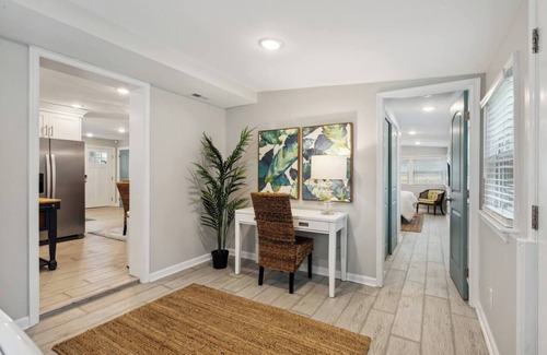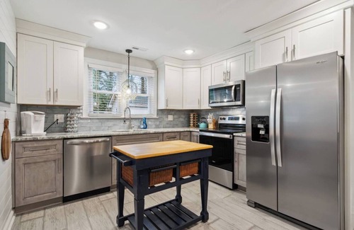 Have fun with the whole family at this stylish place.This property is half a mile from the Beach.This home is an AWESOME group getaway.The bunk bed room is a hit with the kiddos!This home is comfortable inside and out with dining & fenced front yard and backyard fire pit and games. Separate office space and laundry. High Style Coastal Design.