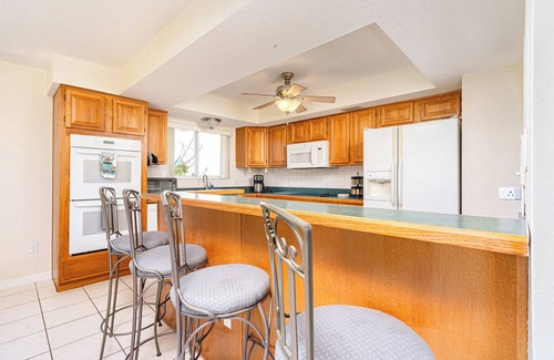 The first floor of the home has an additional kitchen that comes equipped with everything but an oven! The pool entrance is also located on the first floor making this kitchen a great spot to prepare poolside meals. There an additional sleeping area off of the kitchen with a queen bed, flat-screen television, and furnished sitting area. The full bathroom off of the kitchen and two car garage offers an easily accessible walk-in shower with a low edge. This bathroom with an exterior entrance is the perfect restroom when using the pool and beach. The laundry room conveniently contains full units, a utility sink, and an iron/ironing board.