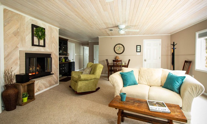 Newly renovated (summer 2017), the large living area has comfortable furniture, 42" flat screen TV with Roku streaming (access Netflix, Hulu, HBO, etc.), ceiling fans and blackout window shades on the large picture window (this side of the house gets morning sun). We love the new wood plank ceiling and know our guests will enjoy the cozy gas fireplace.