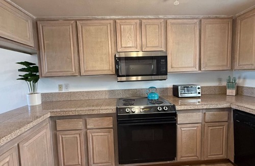 Inside, the home is finished with travertine tile throughout and neutral tones for a clean, modern look. The living room has a 65” Google TV. The kitchen is equipped with a refrigerator, dishwasher, microwave, electric range, and essential cookware, and a coffee machine that works for both Keurig and drip coffee.