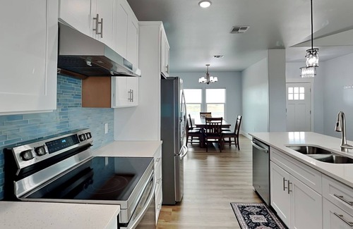 Inside, Sunrise Escape features an open-concept living space filled with natural light and coastal-inspired décor. The cozy living room invites relaxation, while the fully equipped kitchen—complete with a dishwasher, blender, stove, coffee maker, and all the cookware you need—makes home-cooked meals easy. Each of the three bedrooms is thoughtfully furnished with plush linens for a restful night’s sleep, and the bathrooms are stocked with fluffy towels. A washer and dryer are also available for added convenience during longer stays.