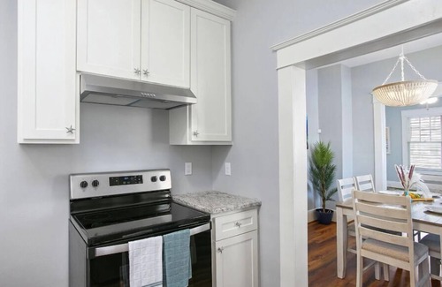 The living room has a 75" Smart TV and a sleeper couch with an upgraded mattress if anyone wants their own space. Utilize the stocked kitchen if you want to cook or visit one of the restaurants within walking distance. The small, private backyard has a propane grill, and is perfect for a small pet. Take advantage of the full washer and dryer set in the garage.