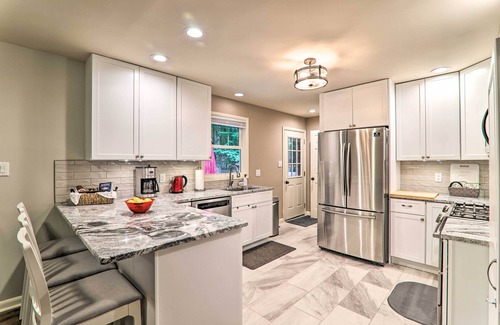 COOK AND DINE: Fully equipped w/ cooking basics, breakfast bar w/ bar stools, dishwasher, coffee maker, Instant pot, knife set, microwave, kettle, dishware & flatware, and comes fully equipped with cooking utensils, pots, pans dishes, serving bowls and silverware (trash bags, paper towels and dish soap are all provided)