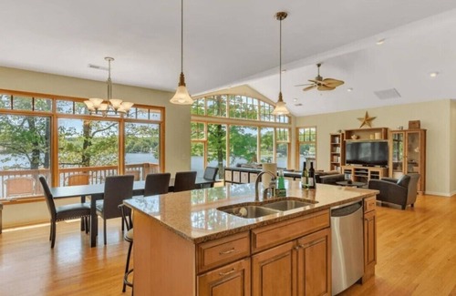 Sunsational is a gorgeous waterfront home that offers 5 bedrooms! When you open the front door you are greeted by a wall of windows and water filled scenery. A large open floor plan that is made for family fun awaits you! The kitchen is very well equipped with everything needed for meal preparations and includes stainless steel appliances and both drip and Keurig coffee makers. The dining area has a large table with ample seating that will accommodate 6. A kitchen island with 5 additional bar stools makes it an ideal spot for a snack or simply spending time visiting in the kitchen. Multiple outdoor decks, complete with lots of comfortable seating to enjoy the spectacular views as well as grilling your evening meal. In keeping the family unified, the living area is adjacent to these areas so that the chef will not miss the game on TV while cooking up wings for the game.