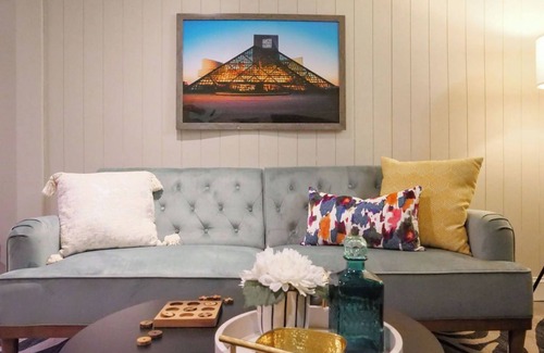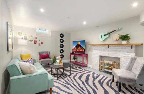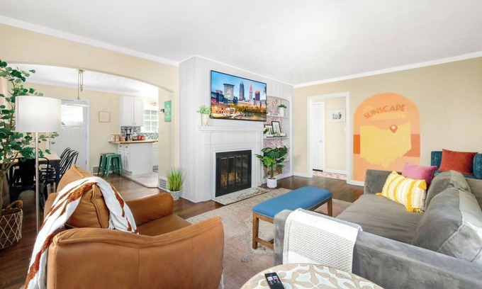 Welcome to Sunscape Bungalow! This charming 3-bedroom home in South Euclid features uniquely themed rooms: Sunrise, Sunset, and Twilight, each designed for comfort and relaxation. Enjoy the Rock 'n Roll Hall of Fame-inspired game room in the basement—perfect for family fun!