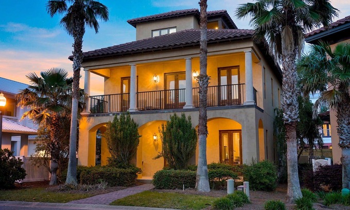 Sunset at Miramar is a stunning, Mediterranean-style home in Miramar Beach, Florida. It boasts views of the Gulf from a third-floor master bedroom, spacious bedrooms, comfortable living space, and a gourmet kitchen. This one-of-a-kind vacation rental is located in the gated community Emerald Waters Village, which provides two community pools and deeded beach access within walking distance! The home offers five bedrooms and four and a half bathrooms to accommodate up to 12 guests.