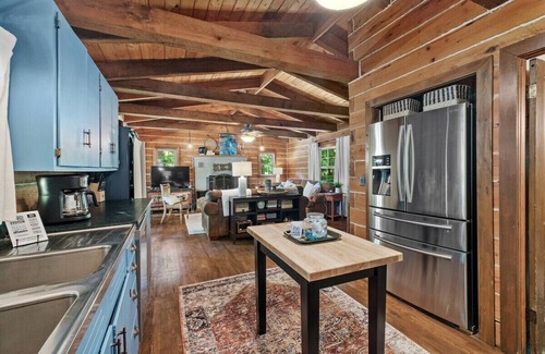 When you're not enjoying our outdoor space, the log-cabin interior offers 2 private bedrooms (one King, one Queen/Twin/Twin), a fully equipped kitchen, and a spacious living room with cozy seating around the wood-burning fireplace.