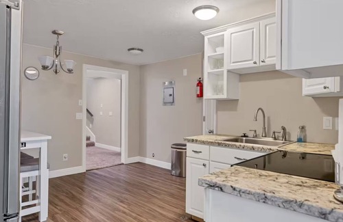 • Kitchen: The basement kitchen has a stove, refrigerator, coffeemaker, sink, and seating for 4.