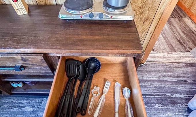 - A simple kitchenette with a camping stove and cooler for your basic cooking needs.