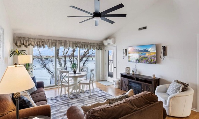 The living room features high ceilings, a sofa with a queen-sized bed, loveseat with a twin sized bed, side table, flat screen TV, an electric fireplace, a dry bar with a Keurig coffee maker, and access to the lake front balcony.