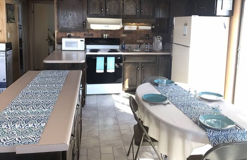 Take a step inside of “Sunset Haven” to find an immaculately clean, fully furnished, and comfortable living space. A fully stocked kitchen with seating for 6 and a spectacular open living area featuring panoramic views of the lake will take your breath away as you enter. This area contains a SMART TV, a queen size sleeper sofa, a queen size futon, and a wood stove for use in colder months. This property is wheelchair friendly as the 4-ft sliding glass door leads into the open living space from the ground-level deck. Continue on to find a newly remodeled bathroom and 2 bedrooms with sleeping arrangements as follows: