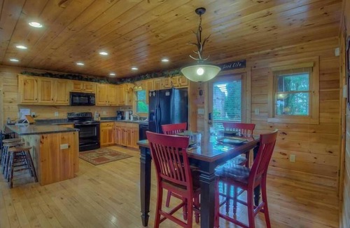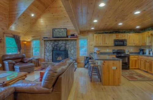 Perhaps the home's welcoming front porch will have you racing inside to tour this lovely lodge, sure to make your vacation 'just right.' Not too big or too small, the interior features a lovely open floor plan. A cheerful dining table for four flanks the well stocked kitchen for all of your gourmet cooking needs. The comfortable kitchen breakfast bar overlooks the two story great room filled with upscale leather furnishings, wood burning fireplace, and a large, flat screen TV. The open feeling continues with an upstairs loft offering a pool table and additional seating.