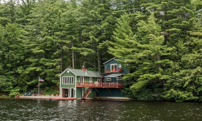 Relax and renew in a classic, comfortable, updated lodge and boathouse directly on the MAIN BAY of Upper Higley Flow. Stake out your spot on our large, sunny private deck, tie up your boat downstairs, fire up the gas grill or go fishing from the dock! Watch some Satellite TV, listen to the Music Channels. or read in the quiet waterside garden - Also a good spot for the kids, complete with their own picnic table and firepit for toasting marshmallows. Sleep under fresh quilts and coverlets in Adirondack decor. Enjoy 180 degree water views. Cook in the updated, eat-in & fully equipped kitchen with a water view! Dive into deep water off the dock or walk into shallow water using our convenient steps. Amazing sunsets and starry starry nights. Breathe deeply, this is living!