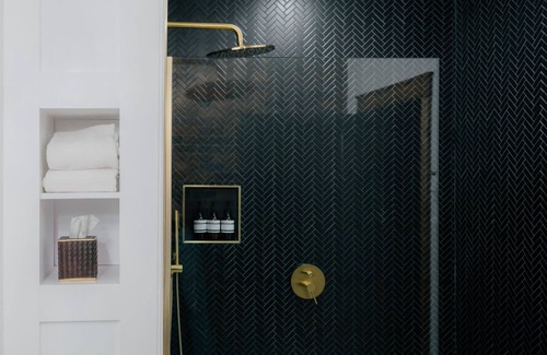 This boutique experience at the Sunset on Broadway suite includes an oversized luxurious shower, local bath amenities, double vanity, mini-fridge, curated local coffee experience, SmartTV (complimentary Netflix), along with a king bed featuring premium bedding and luxe mattress.