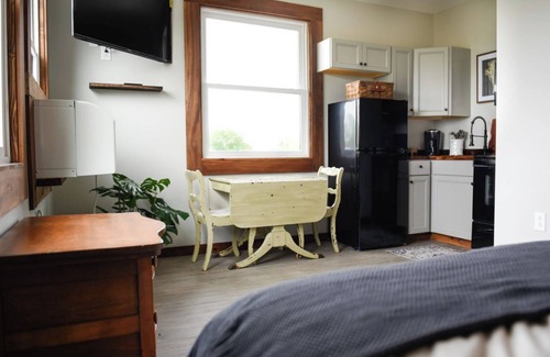 Discover the charm of Madison from our cozy suite, "Sunset over the City" Suite 201. Perfect for couples or solo travelers, this 1-bedroom, 1-bathroom rental offers a beautiful view of Historic downtown Madison. Enjoy modern conveniences like a full kitchen for your culinary adventures, laundry facilities, and all the essentials. Located in the heart of Madison, you're perfectly positioned to explore the city's delights. Don't miss the breathtaking sunsets.