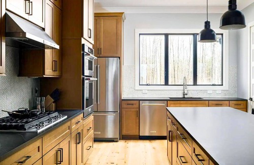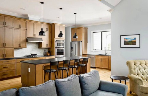 Discover the heart of our home in the beautifully designed kitchen, a culinary enthusiast's dream. Fully equipped with a gas range, ovens, dishwasher, coffee maker, microwave, and all necessary cookware and utensils, it’s ready for any cooking adventure. The open design includes a large island with barstools for casual dining or socializing. Adjacent to the kitchen, you'll find a handsome dining table that seats eight, perfect for family meals and engaging conversations. Whether you’re whipping up a gourmet feast or a quick snack, this kitchen has everything you need in a stylish, functional space.