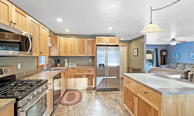The cabin's warm and inviting interiors provide a rustic yet comfortable atmosphere, making it an ideal haven after a day of outdoor activities. Unwind by the propane fireplace, sipping on hot cocoa as you recount the day's adventures. The fully equipped kitchen allows you to whip up delicious meals or warm up with a hearty soup.