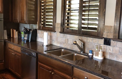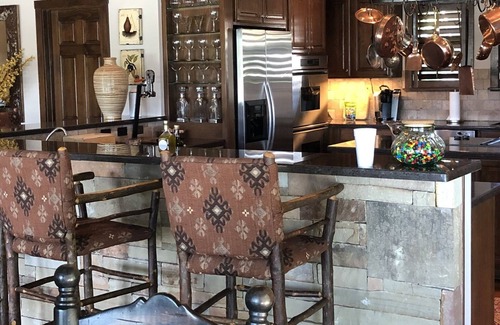 The kitchen is a chef’s dream and perfect for cooking large meals with plentiful granite countertops and bar space. Kitchen appliances include Dacor double ovens, KitchenAid ceramic electric cooktop, under the counter microwave, KitchenAid side-by-side refrigerator and freezer, a “Sonic-style” crushed ice machine, and a separate sink for the bar area.