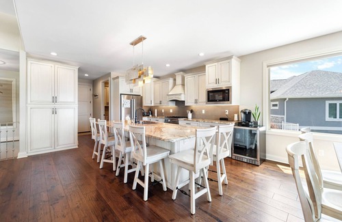 Head downstairs where you will be greeted with another living area where you can catch your favorite show on the flat screen tv or challenge friends to a game of Galaga. This space is set up for entertaining with a full size pullout murphy bed, a kitchenette complete with a full size refrigerator, sink, coffee maker, microwave, and Keurig combo. Enjoy your beverages on the lakeside deck off this living room. You'll also find four more bedrooms and two full bathrooms with three of the bedrooms furnished with queen beds and a king bed in the other bedroom.