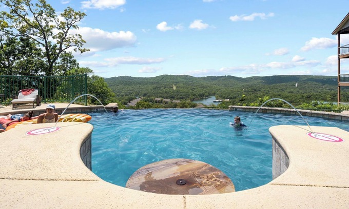 Peace and tranquility are what you’ll find at the Sunset Overlook, a stunning home situated atop a cliff with panoramic views of the lake below and the surrounding Ozark Mountains.