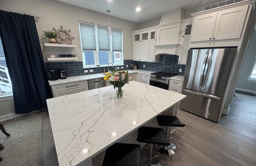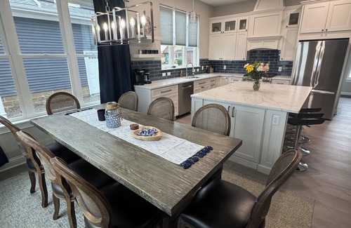 Inside you will find an open floor plan with windows on the entire side of the house with views of the lake and sunset. The cook’s kitchen has new top of the line appliances and is fully furnished with cookware, bakeware, utensils, and dishes. There is a massive island to spread out all the food or sit at while entertaining. You will find a 1/2 bath downstairs next to a walk in pantry. For your convenience is a large laundry room with new large capacity washer and dryer. The first floor primary suite and upstairs bathrooms all have walk in showers and bidets with heated seats. The “kids room” has a large shower that is also a bathtub. All bedrooms have their own bathroom, are nice sized, includes ceiling fans for your comfort, and dressers for you to unpack and make yourself at home.