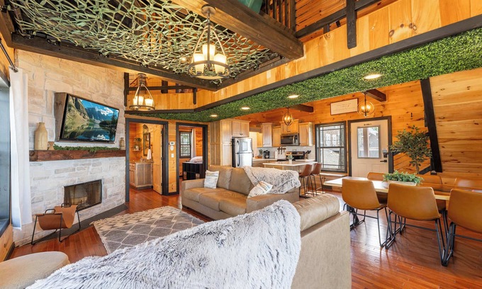 Kids (and kids at heart) will love the indoor adventure zone—a unique space with a rock climbing wall, crawl-through tunnel, and twisty slide leading to a tree net loft that playfully overlooks the living space below. One of the bedrooms is located right in this playful zone, making it a dream come true for adventurous little ones or the young-at-heart. The other two bedrooms offer plenty of comfort and cozy charm, each outfitted with a Smart TV and electric fireplace for a restful retreat after a day of fun.