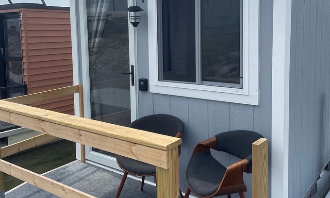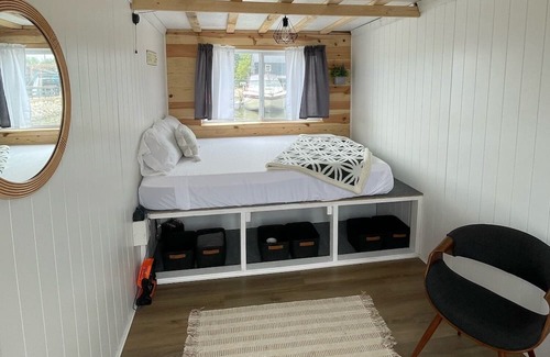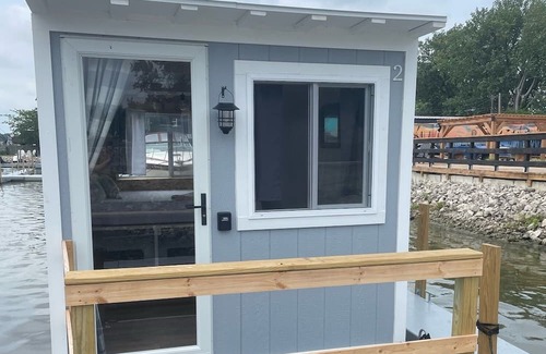 Unit remains docked at SoLSTAY Marina on Lake Erie's Castaway Bay. It is furnished with a queen bed, 2 modern reading chairs, a side table and under bed baskets for storage. Chairs can be taken in and out of the unit to enjoy the front viewing deck. This is a tiny houseboat located directly on Lake Erie. Each boat is unique. You will have to walk off the boat to use the restroom facilities and other amenities.