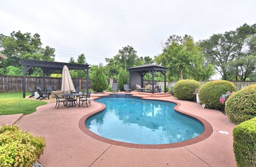 Consider this house your home away from home while you visit Tulsa. This charming property boasts 4 bedrooms with 2 king beds and 2 queen beds, perfect for a group getaway. Enjoy the soothing ambiance of the pool and the sunset and unwind in the cozy living spaces. With 2 bathrooms equipped with hair dryers, your comfort is our priority. Kickback, relax, and enjoy everything Tulsa and our house has to offer.